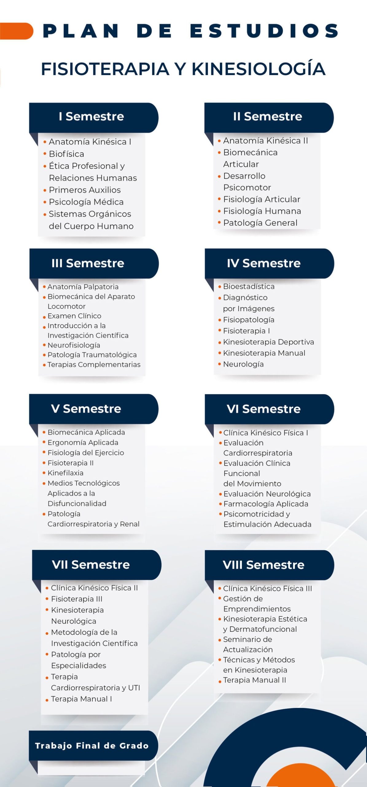 Tiene un plan de estudios único, con asignaturas como Kinesioterapia Manual, Kinesioterapia Deportiva, Fisiología del Ejercicio, Ergonomía, Evaluación Clínica Funcional del Movimiento y Técnicas de Evaluación, que forman especialistas en el área de la terapia manipulativa.